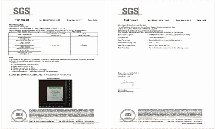 Power Pak 防霉除臭片(多国语)完全符合美国试验与材料学会d4576-86(1996批准)的抵抗霉菌测试标准,提供的防霉抗菌剂也完全符合美国试验与材料学会d4576-86(1996批准)的抵抗霉菌检测标准。