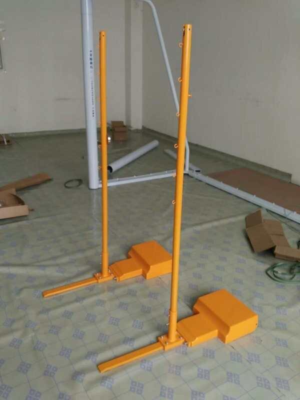 底座采用优质ABS塑料材质,内部水泥浇筑,带移动轮子,重量70公斤1付立杆为标准40管,厚度2mm顶端加厚滑轮,电镀紧线器,底座尺寸60*33*10cm