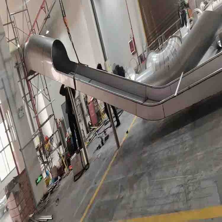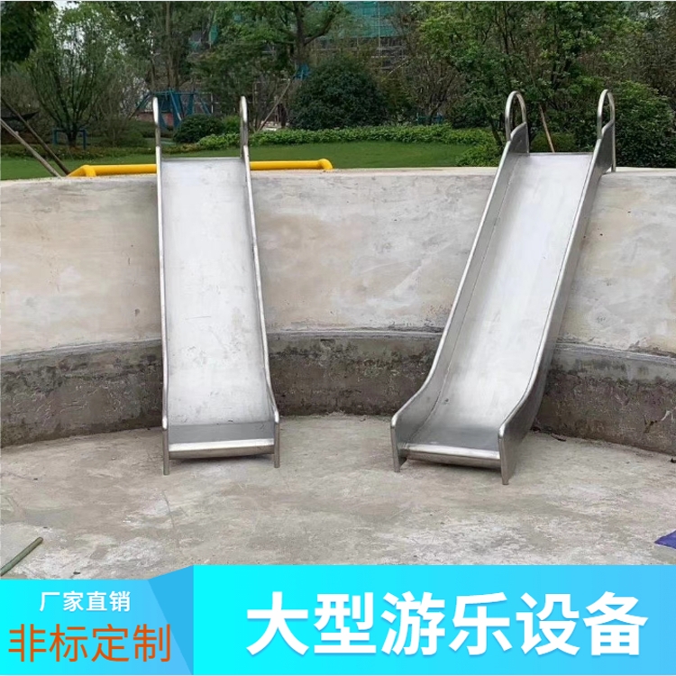 公园不锈钢滑道本体材料采用304不锈钢材料,板厚3mm。扶手部分采用φ32×2的不锈钢304管包边。下料:借助于剪板机、折边机、激光开孔机、刨槽机、大吨位冲孔机等各种配套模具,拼缝高度吻合等新工艺,避免传统手工下料角度不连贯、随意性大、不美观、等缺点.焊接:操作工艺1)焊接采用氩弧焊焊前严格清理氧化物、油脂、涂层等垃圾物,避免引起熔核成形不良,杜绝未焊透等质量问题的发生.2)焊接前应领会图纸的技术要求,严格按照图纸要求进行施工,在将焊接件按图纸尺寸要求定位好后,用工艺撑杆加强、加固,以防止或减小在焊接过程中产生的焊接变形,确保产品质量.3)选用好合适的不锈钢焊丝,焊接速度跟据个人的实际能力而确定氩弧焊速度.4)焊缝宽度应均匀、高低起伏应一致,焊缝应美观、漂亮抛光拉丝技术要求1)纹路粗细一致均匀,产品每一面的纹路根据产品的设计要求,方向一致,产品的弯位允许有轻微的不影响产品外观的紊乱纹路.2)不允许有毛坯面残留.