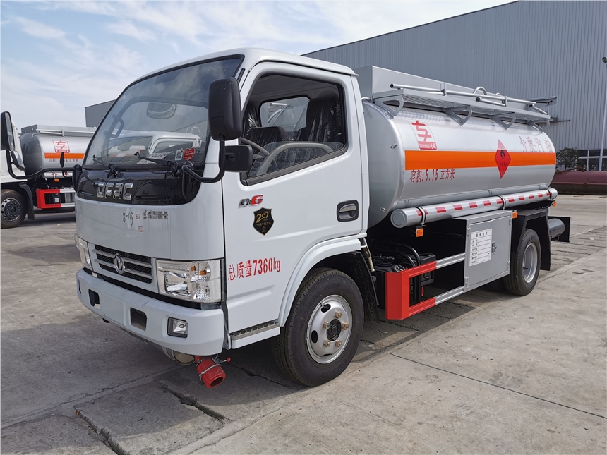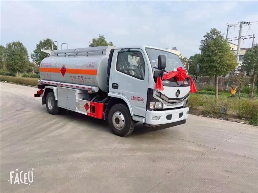 东风小多利卡4吨油罐车,国五102马力发动机(玉柴115马力),五档变速箱。轴距3300,700钢丝胎,气刹,手拉刹,方向助力。前轮盘式制动,限速装置,ABS。罐体公告容积4.43立方,实际容积5方,运输介质:柴油。1个欧标罐口,一个海底阀,智能海底阀报警系统,带安全护栏,带泵,可泵进泵出,后爬梯,全套欧标(包括放溢流探杆,下装油口,废气回收),原厂正星大流量加油机及15米自动复位卷盘。