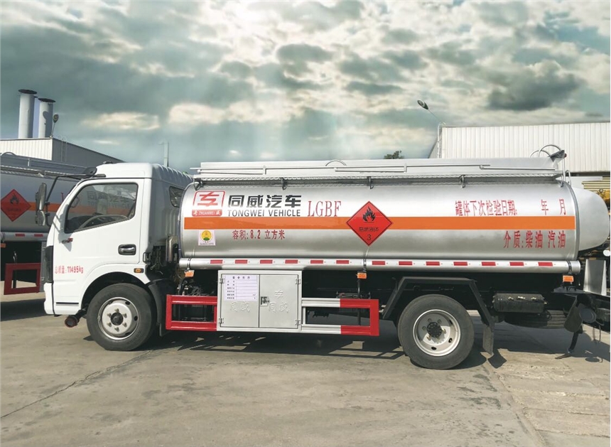 上装配置:公告容积8.2立方,带大流量加油机下挂,15米自动回位卷盘,及加油枪,罐体材料Q235碳钢,国标5MM厚,一次性水压封头6MM厚,单仓带防浪隔板,带输油泵,可泵进泵出,全套欧标(一个欧标罐口,一个海底阀,下装油口、废气回收、防溢流探杆及静电插座),一个工具箱,铝合金折叠护栏,罐尾一个爬梯,两个反G板,一个防火冒,两根与罐长等长输油管,两个灭火器,罐体防锈漆,贴3M牌反G条,反F带,安全告示,三个“易燃液体”标。介质:柴油。