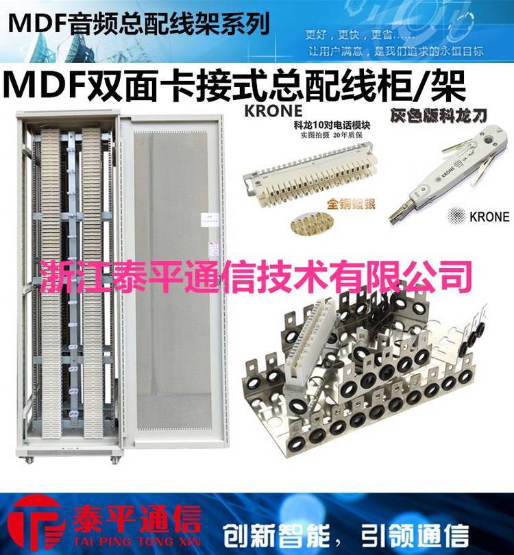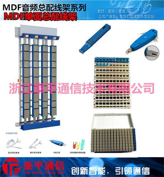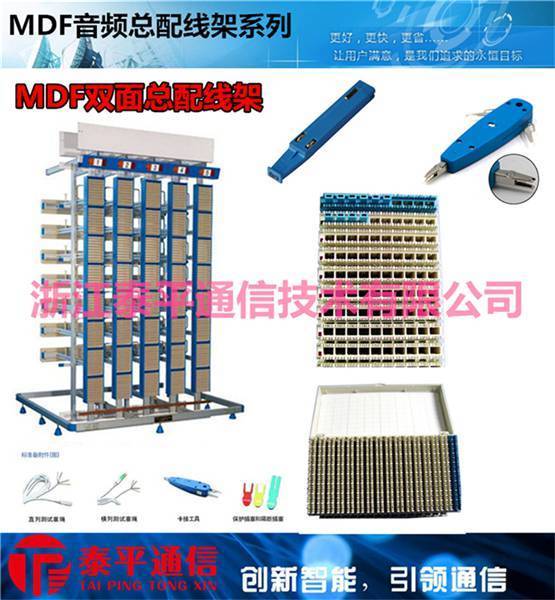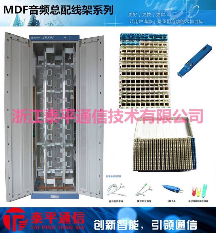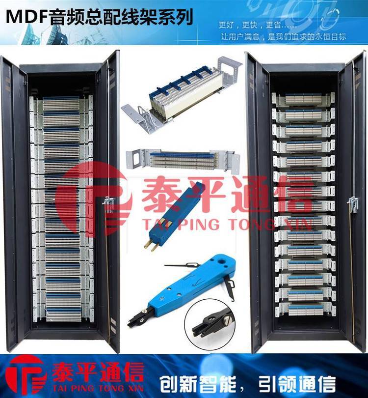 MDF卡接式音频总配线柜(架) MDF总配线架,MDF总配线架,MDF音频配线架,MDF电话配线架,MDF语音配线柜 主要特点:高密度、大容量?每直列2600mm高、容量达1200线,2200mm高、容量达1000线,密度比同行当前常用产品提高46;同时利用直排宽度小的特点,适用于200mm的特殊场合;防护、安全?过压过流保护性能与多种型号的交换机二级保护电路相匹配,确保对交换机的一级保护;所有塑料均采用阻燃材料,其阻燃性能达国际FV-0级标准;保护?完善可靠的过电流、过电压保护功能,特制四级声光告警,便于故障查找和维护;技术 双层折叠式卡接簧片,表面镀金,氧化,电气性能优良,使用寿命比单层簧片长;操作维护方便?内线、外线成端,所有测试操作,告警系统的观察和故障排除均在正面,某路的维护及测试不影响其他线路;具有足够的走缆布线空间,便于操作维护;标示清晰?直排、横排均有明确的线对标示;结构灵活?全模块化设计,可根据各形状机房灵活组合,充分利用机房的空间,便于安装和扩容;特制机架?架体采用特殊铝合金型材组件结构,整架无一安装孔,可灵活,安装方便,结构可靠?订货指南:产品配置表?外线?容量每直列容量横列层数每横列标准容量?每横列容量架体尺寸?横列??总容量扶梯(选购)高宽深4000L8块*100L65块*128L6块*128L2000125010504608LXQ901F5000L10块*100L72200125010505376LXQ901F6000L12块*100L92600125010506912LXQ901F |