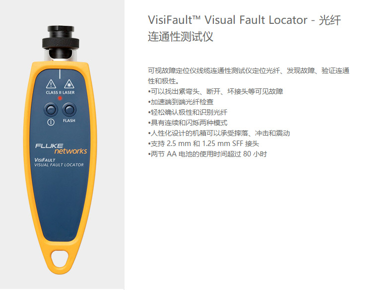福禄克FLUKE光纤可视化故障定位仪VisiFault光纤连通性测试仪仪诊断和修复简单的光纤链路问题。可对光纤进行定位,验证光缆连通性和极性。