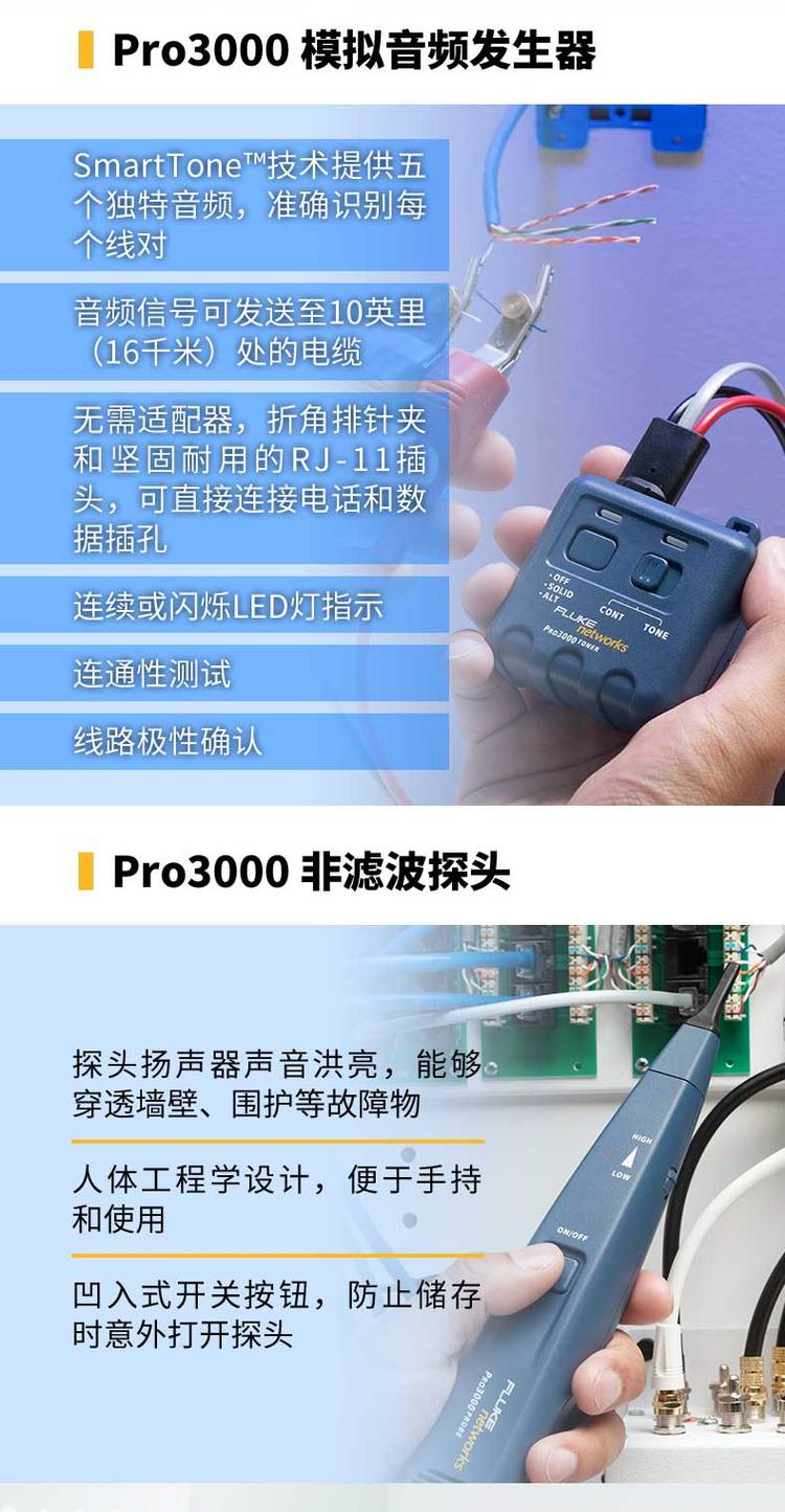 使用 Pro3000 模拟音频发生器的 SmartTone 功能可以识别正确的线对。将电线接触到一起并且立即缩短线对的远端时,SmartTone 技术将改变产生的音频的节奏。您通过探头听到的音频变化可以有效验证线对是否正确。SmartTone 技术可提供五个 的音频用于准确的线对识别。