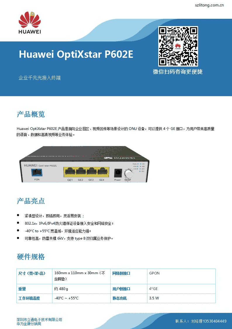 Huawei OptiXstar P602E 产品是面向企业园区、视频回传等场景设计的ONU 设备,可以提供 4 个 GE 接口,为用户带来高质量 的语音、数据和高清视频等业务体验。