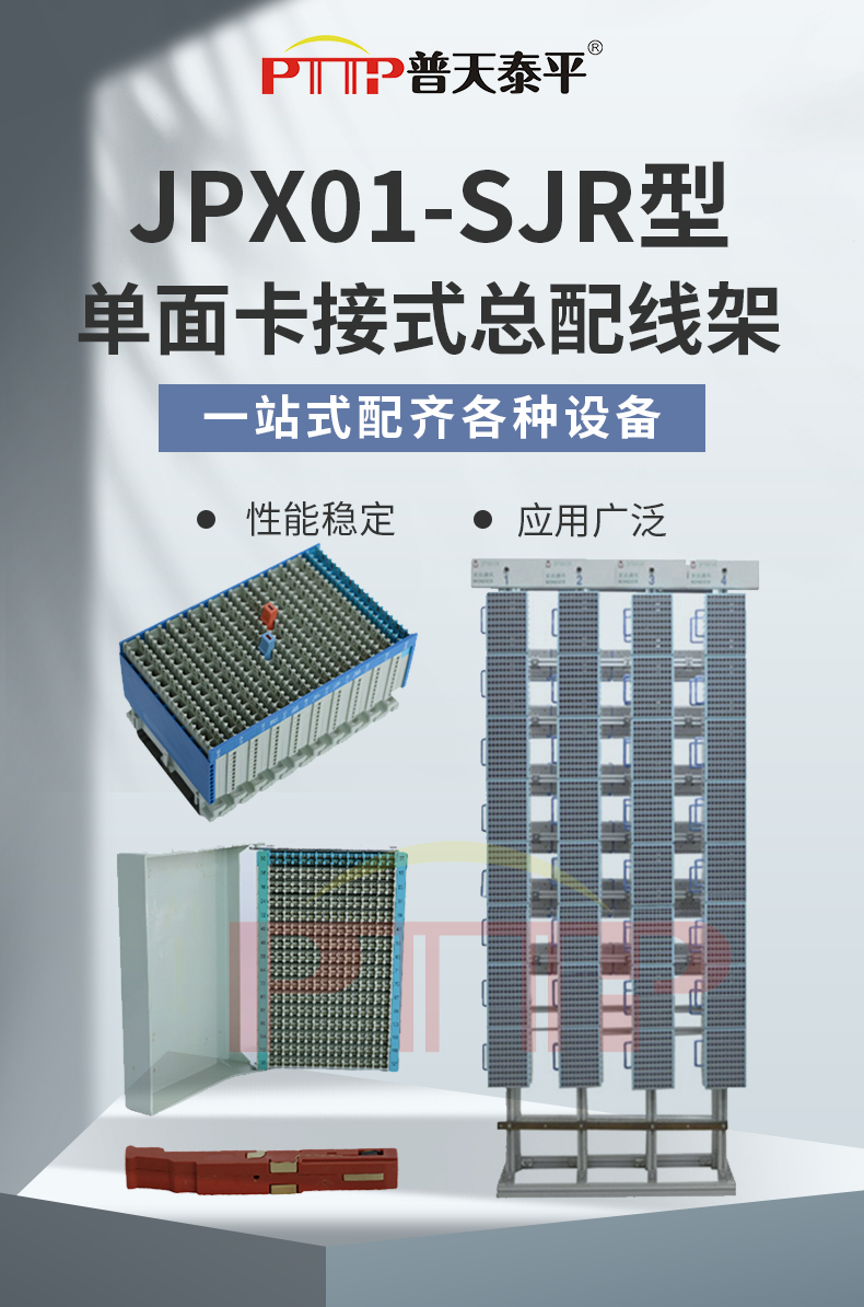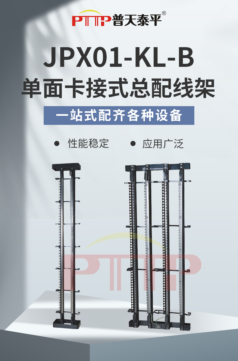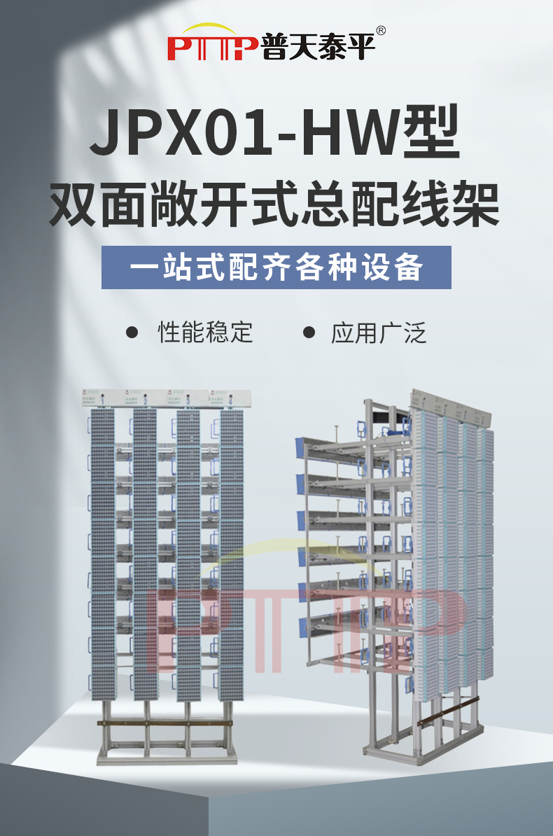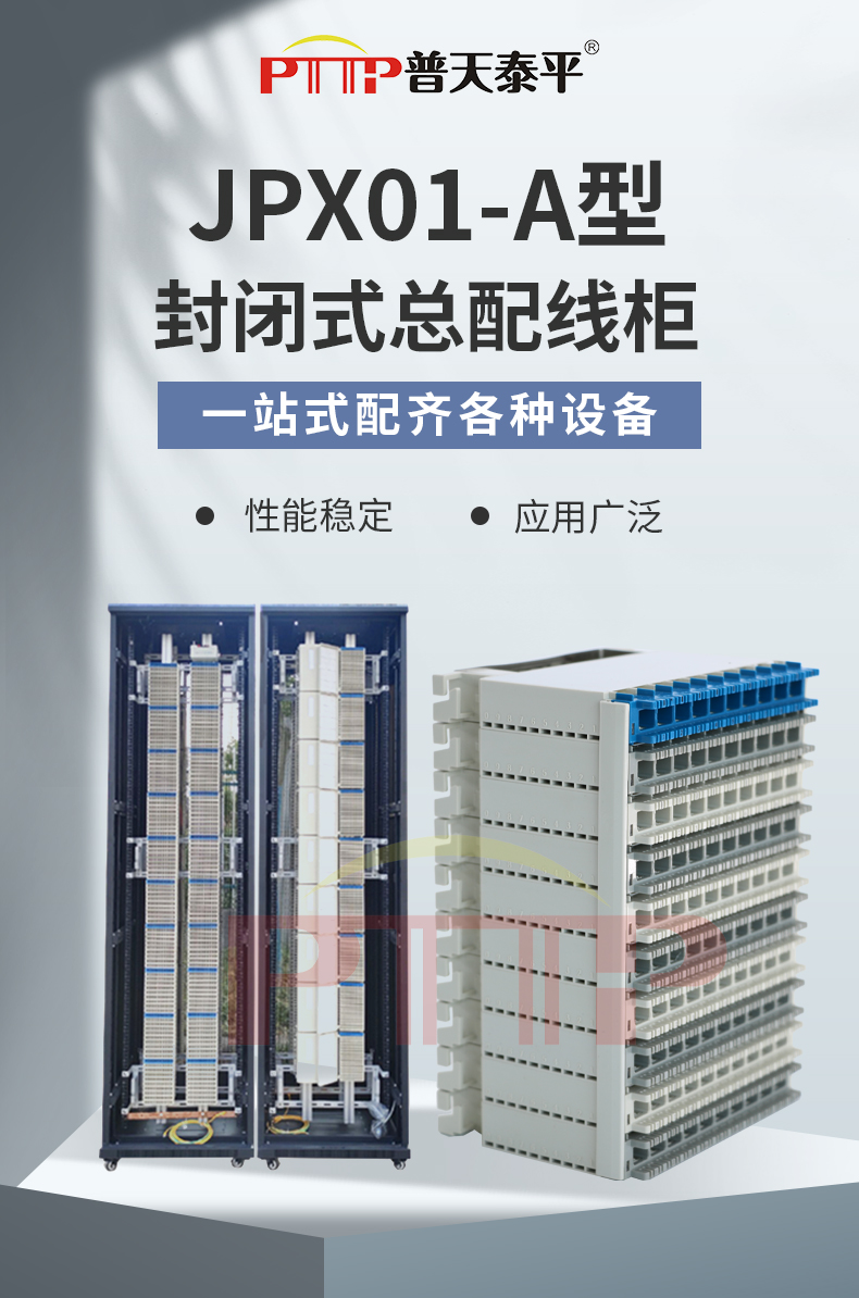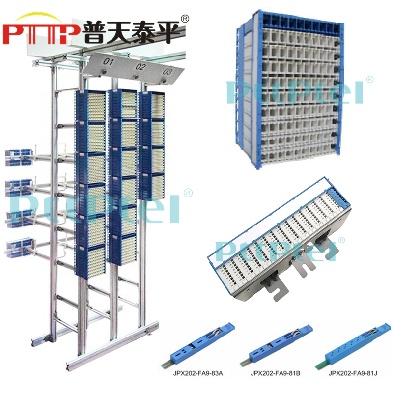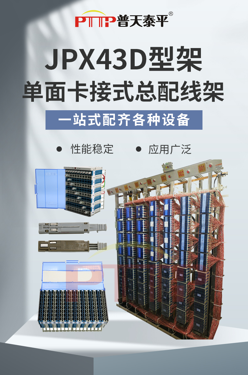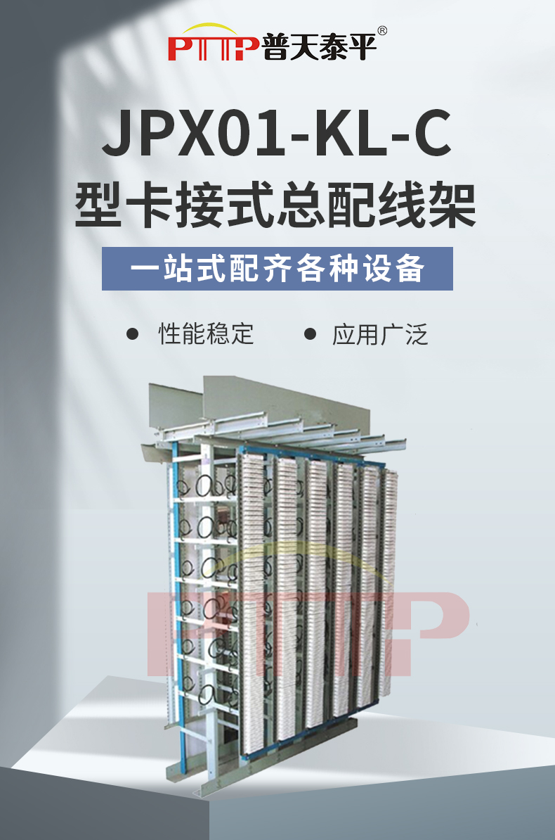 PTTPbbb JPX01 型总配线架从列告警盘、接线排,到底部护栏都提供了易于更换、清洁的列号、块号示名。总配线架由机架、保安接线排、测试接线排、保安器、总告警盘、列告警组件和附件等构成。