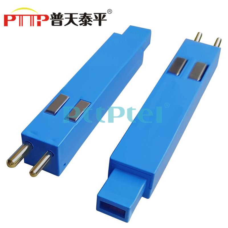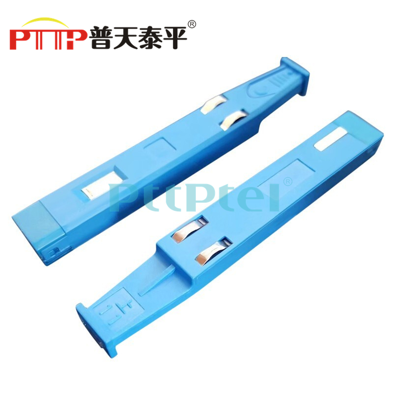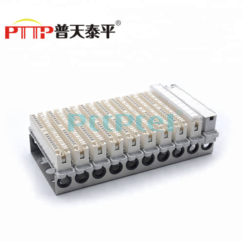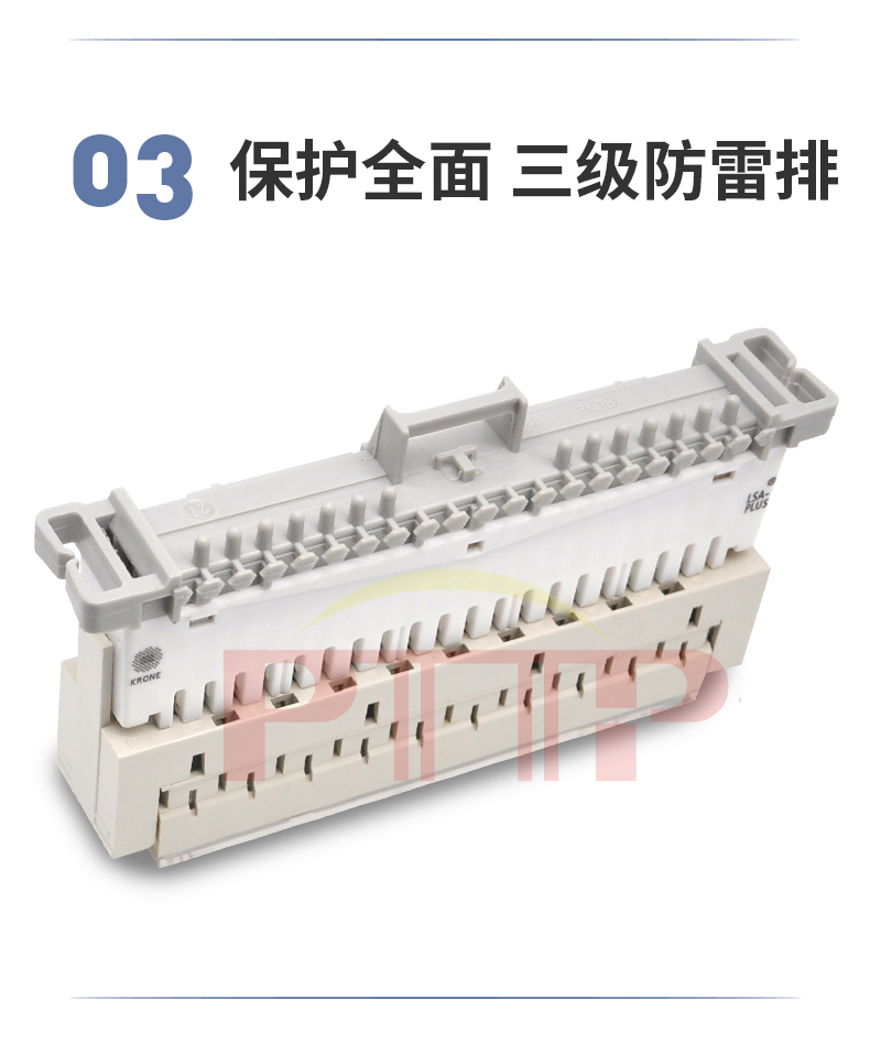 保安单元插入在保安接线排上,当通信线路受强电侵袭出现高电压、潜电流、大电流等情况时,起到保护作用。保安接线排未插入保安单元时,内、外线处于断开状态,插上保安单元后,内外线路接通。当保安单元插入保安接线排后,保安单元的接地插脚穿过保安接线排的接地孔与接地条相连接,每个保安接线排的接地条与接地的架体连接在一起,组成了整个配线架的接地系统。