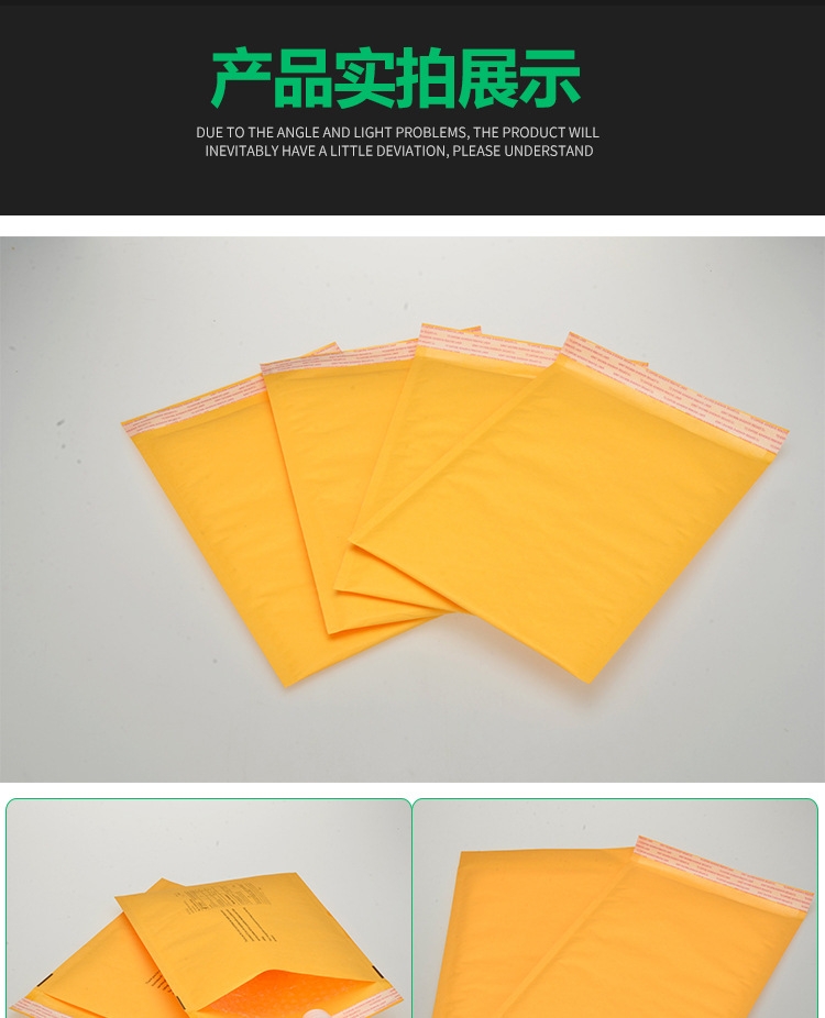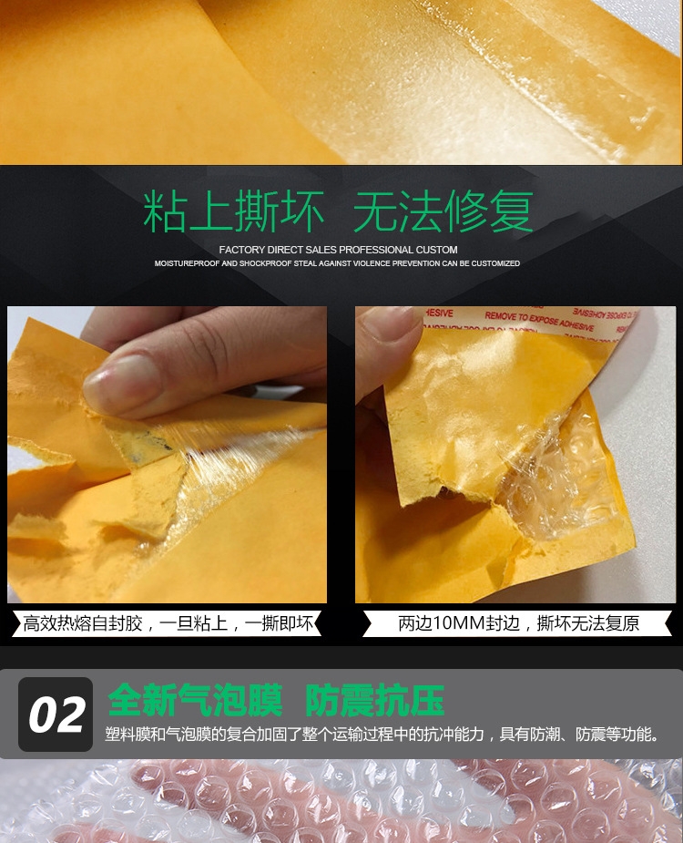 外层采用优质牛皮纸(用于填写地址、增加包装强度),内层使用弹性气泡膜(防湿、抗压、抗震),保护被邮寄物品的安全,防止物品在邮寄过程中因压、碰、跌落而损坏。产品具有防震、防压、防潮、重量轻、使用安全方便、适应性强等特点,是替代小木箱、小纸箱的理想新一代邮件包装品。