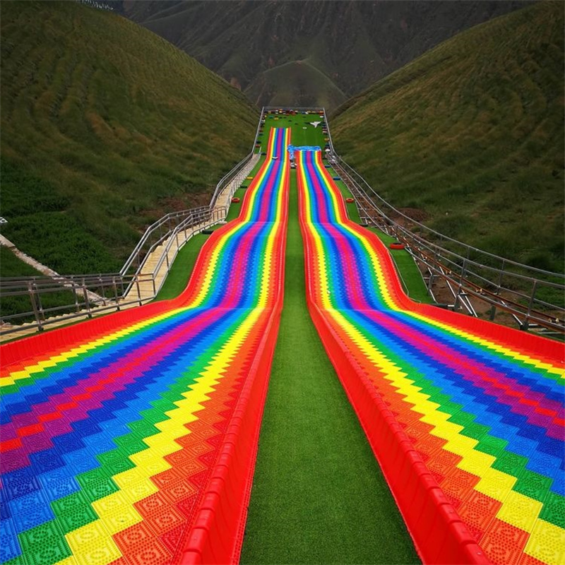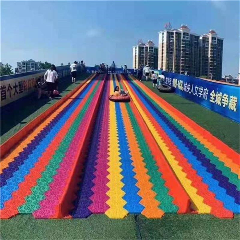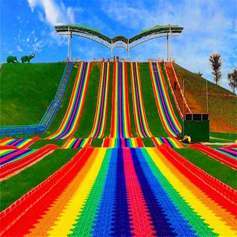 七彩滑道通常由七种不同颜色的滑道组成,如红、橙、黄、绿、蓝、靛、紫等,色彩鲜艳亮丽,在远处就能吸引人们的目光。这些颜色的组合不仅美观,还能给人带来愉悦的视觉感受。滑道一般建在有一定坡度的山坡上,长度和宽度可根据场地大小进行调整。