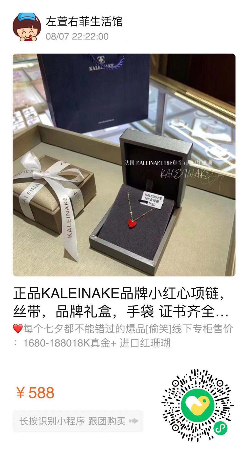 KALEINAKE小红心项链,起源于全世界最浪漫的法国!优雅,经典永恒就是它产品设计的核心,它的每款产品都是一生永不落伍的时尚之物,可代代相传的珠宝。难怪大幂幂这么喜欢这颗心,它既有少女的灵动,又有女神的温柔气质,沈梦辰三年都没舍得下手的小红心项链,为什么那么多明星都爱不释手。明星同款小红心项链,最吸引眼球的那颗朱砂痣,大牌明星章泽天、杨幂、沈梦辰、唐嫣等等明星都在佩戴的小红心项链,看一眼就感觉格外优雅浪漫,我最在意的是它好减龄,少女心爆棚。专柜全套包装,每条项链都是18K真金+进口红shanhu!每一条都有一张鉴定zhengshu。现左萱右菲生活馆给你最实惠的价格,好物推荐,不容错过!明星杨幂沈梦辰唐嫣章泽天同款小红心项链,左萱右菲生活馆!
