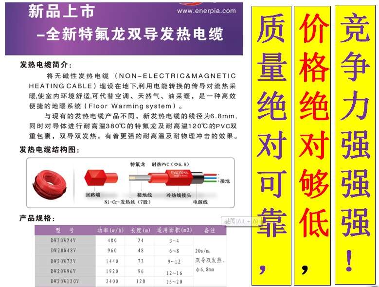 1、双导双发热电缆地暖,全新特氟龙绝缘,耐高温;