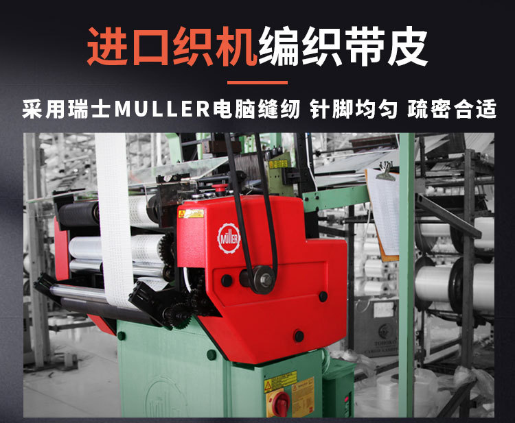 采用涤纶织带缝制,双线走边针脚细密,做工精细。