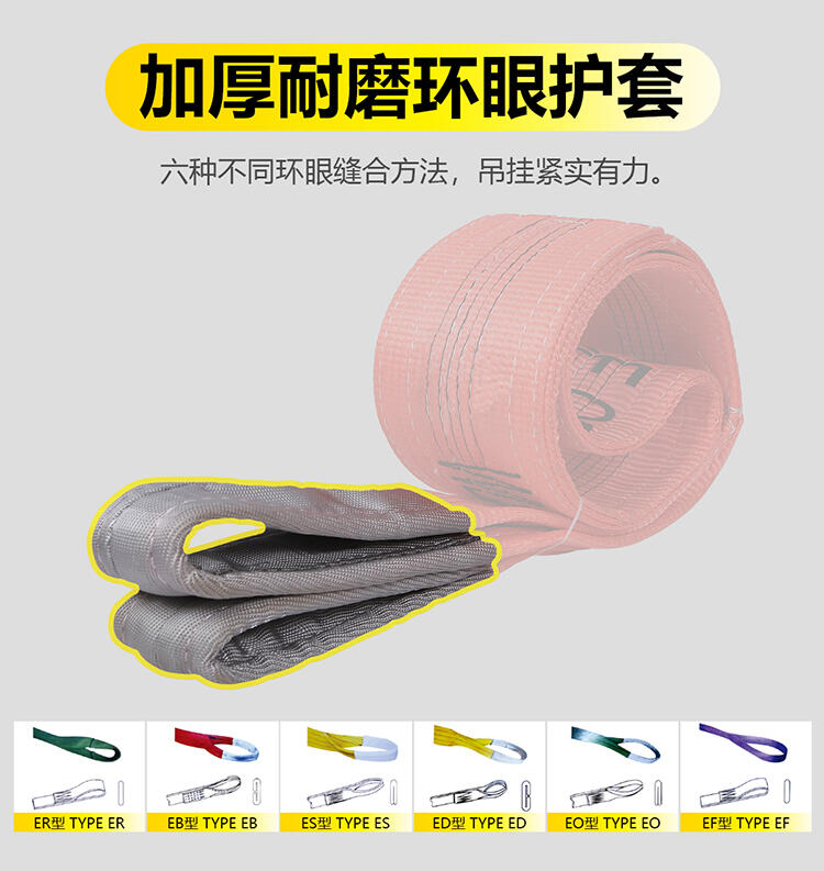 扁平吊装带是采用PES通过编制缝合制成,并且吊装的两端可使用加强的环眼或金属配件来增加强度。