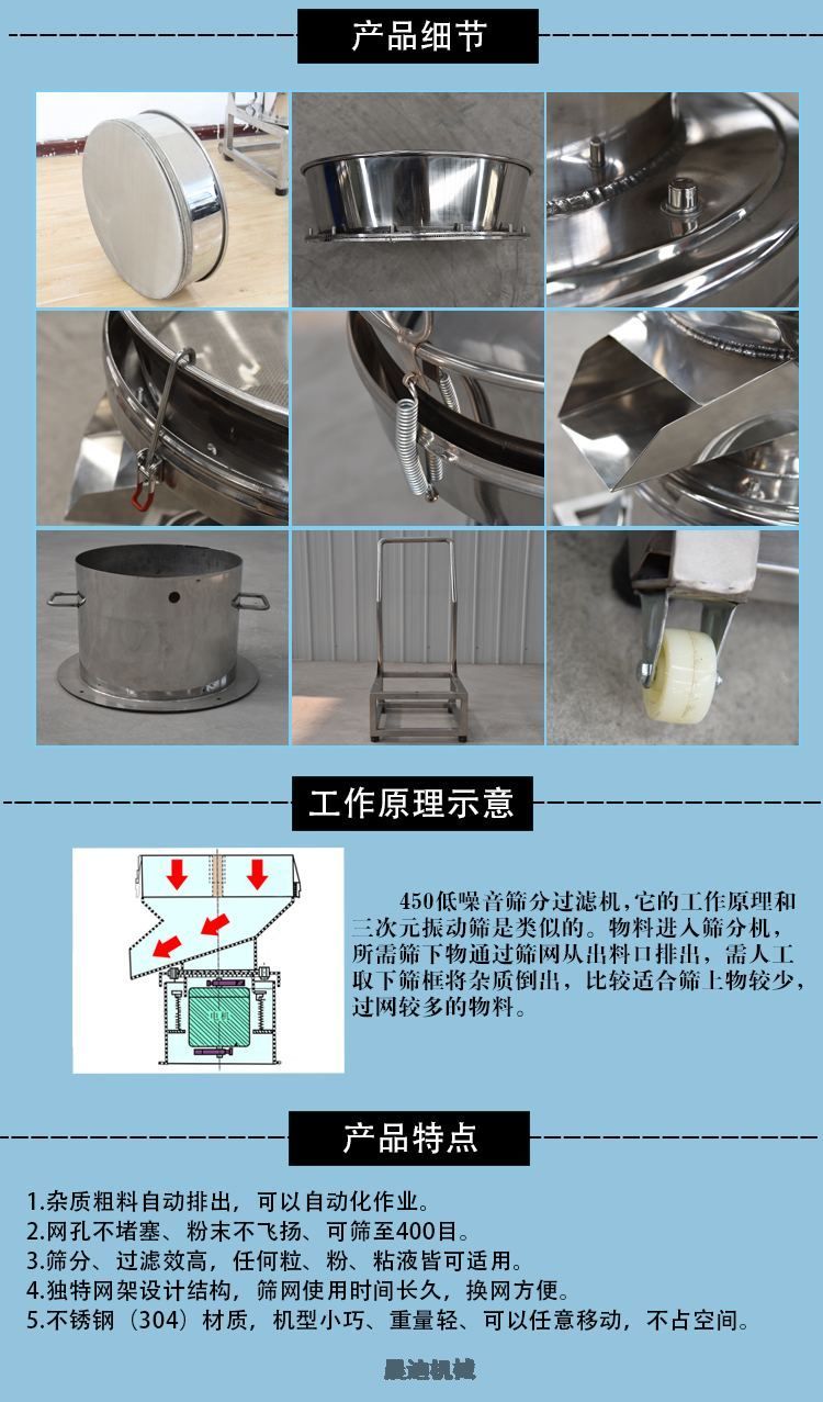 450过滤筛是一种单层筛分过滤设备,广泛用于食品、医药、实验等行业,可用于处理生产量小杂质少的物料,该设备通过重锤激振产生三维运动轨迹,实现物料高效筛分,具有400目精细筛分能力及防堵网设计。其结构包含筛筐、振动装置、电控系统等核心组件,采用不锈钢材质与紧凑型设计,支持快速换网和连续生产,450过滤筛主体由机体、振动装置、下料斗、筛筐及电控系统构成 [1]。筛框采用金属丝编织网设计,部分机型配备超声波振动组件以提高清网效率,电机驱动重锤产生激振力,使筛体形成水平、垂直、倾斜的三次元运动。物料在筛面中央向外扩散运动,细小颗粒或液体透过筛网完成分级 。