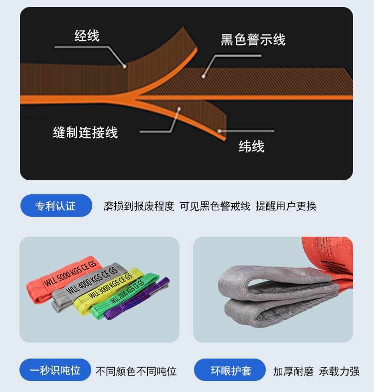 扁平吊装带对于磨损及损坏有更高的防护性,在一般吊装使用的扁平吊装带中,其具有相当长的工作寿命,但同时在吊装作业中也须配合正确的保护套,以预防吊带受到利器或被吊物的割伤。